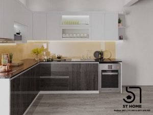 Bếp và phòng ăn được bố trí không gian mở ở giữa có đảo bếp tiện dụng cho việc chuẩn bị nguyên liệu nấu nướng,… Tủ bếp thiết kế kiểu chữ I gồm 2 tầng được bố trí công năng đầy đủ